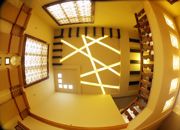 വീടിന്റെ പ്രവേശന കവാടത്തില് നിന്ന് അകത്തളത്തിലേക്ക് കടന്നാലും വിസ്മയിപ്പിക്കുന്ന അനുഭവം തന്നെ. ഇറ്റാലിയൻ മാർബിളിട്ട നീണ്ട സിറ്റ് ഒൗട്ട് ചെന്നു കയറുന്നത് പ്രൗഢഗംഭീരമായ ഗസ്റ്റ് ലിവിങ് സ്പേസിലേക്ക്. വുഡൻ–െഎവറി നിറങ്ങുടെ വശ്യചാരുതയിലുള്ള കാഴ്ച വിരുന്നാണ് ഇൗ സ്പേസ്. വെന്റിലേഷന് പ്രധാന്യം നൽകി വെളിച്ചത്തെ ആവോളം ഏറ്റെടുത്ത ഒരിടം. നാലു ജനാലകൾ കൂടാതെ ഡിസൈൻ ചെയ്ത ഗ്ലാസുകൾ കൊണ്ടുള്ള മാജിക്.