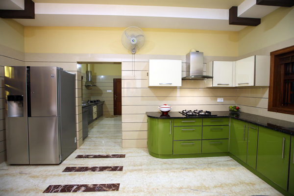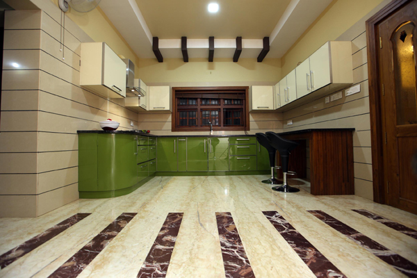 പിന്തുടർന്ന ശൈലിയിൽ നിന്ന് മാറാതെയാണ് അടുക്കളയും ഒരുക്കിയിരിക്കുന്നത്. െഎവറി, വുഡൻ നിറങ്ങളുടെ കൂടെ കെല്ലി ഗ്രീൻ (kelly Green) നിറം കൂടി ചേർത്തിട്ടുണ്ട്. സ്റ്റോറേജിന് പ്രാധാന്യം നൽകി കൊണ്ടാണ് മോഡുലാർ കിച്ചൺ സജീകരിച്ചിരിക്കുന്നത്. ബ്രേക്ക് ഫാസ്റ്റ് ടേബിൾ പ്രത്യേകം ഒരുക്കുന്നതിന് പകരം കിച്ചൺ കൗണ്ടറിെൻറ ഭാഗമായി തന്നെ സ്ഥലം കണ്ടെത്തിയിട്ടുണ്ട്. അടുക്കളയോട് ചേർന്ന് വർക്ക് ഏരിയയും ഡിസൈൻ ചെയ്തു.