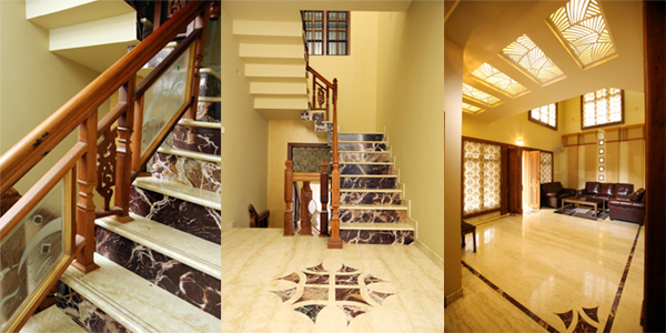 വെളിച്ചത്തെ അകത്തളത്തിൽ അലിയിപ്പിക്കുന്നതിനോടൊപ്പം ഫ്രെയിം ചെയ്ത ചിത്രങ്ങളെ പോലെ അവ ഡിസൈനുമായി ചേർന്നു നിൽക്കുന്നു. ഡൈനിങ് സ്പേസിനെ വേർതിരിക്കുന്ന ചുവരിലും മനോഹരമായ ചില്ലുജനാലകൾ. ലെതർ സോഫയും ഗ്ലാസ് ടീപോയും കൊളോണിയൽ ശൈലിയെ സംഗ്രഹിക്കുന്ന കാഴ്ച തന്നെയാണ് ഇവിടെ ഒരുക്കുന്നത്. ലിവിങ് സ്പേസിൽ നിന്നുമുള്ള രാജകീയമായ മരഗോവണിയാണ് മറ്റൊരു പ്രത്യേകത. സീലിങ്ങിൽ നിന്നും ഉൗർന്നിറങ്ങുന്ന വെളിച്ചം തറയിൽ വിരിച്ച ഇറ്റാലിയൻ മാർബിളിൽ പ്രതിഫലിപ്പിക്കുന്നു.