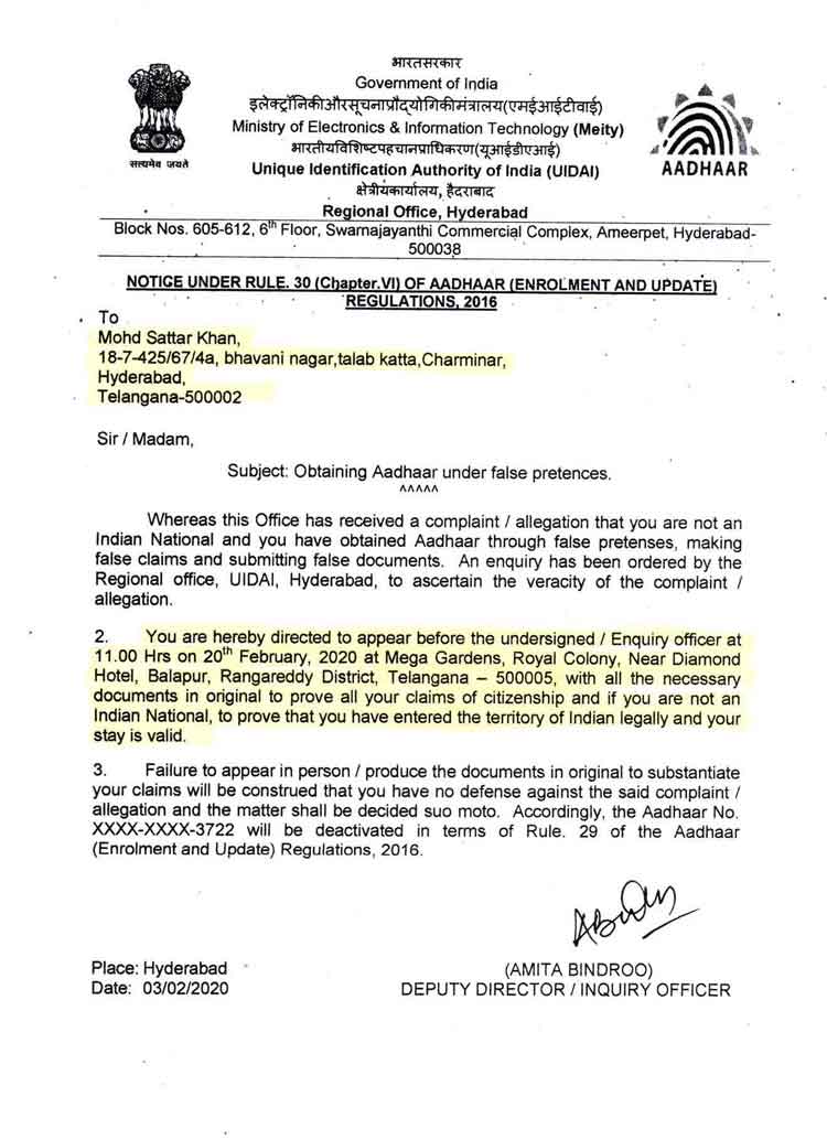 വ്യാജ പ്രമാണങ്ങൾ ഹാജരാക്കിയല്ല ആധാർ ഐ.ഡി നേടിയതെന്നതിന് തെളിവ് നൽകണമെന്നാവശ്യപ്പെട്ടാണ് െഫ ബ്രുവരി 3ന് അതോറിറ്റിയുടെ ഹൈദരാബാദ് റീജണൽ ഓഫീസ് മൂന്നുപേർക്കും നോട്ടീസ് നൽകിയത്. പൗരത്വത്തെക്കുറിച്ച ് റീജണൽ ഓഫീസ് വിശദ അന്വേഷണം നടത്തും. മൂന്ന് പേരും പൗരത്വം തെളിയിക്കുന്ന സർട്ടിഫിക്കറ്റുകളുടെ അസ്സൽ പകർപ്പുകൾ െഫബ്രുവരി 20ന് അന്വേഷണ ഉദ്യോഗസ്ഥന് മുമ്പിൽ ഹാജരാക്കണം.