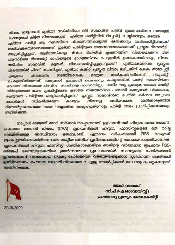 പണിയ കോളനിയിലെ അമ്മയെയും മകളെയും ബന്ധുവായ സ്ത്രീയെയും ടൂറിസ്റ്റുകൾ വഴിയിൽ തടഞ്ഞ് റിസോർട്ടിലേക്ക് െകാണ്ടുപോകാൻ ശ്രമിച്ചതായും അതിന് റിസോർട്ട് നടത്തിപ്പുകാർ ഒത്താശ ചെയ്തതായും നാടുകാണി ഏരിയ സമിതിയിലെ സഖാവാണ് ഏരിയ കമ്മിറ്റിയിൽ റിപ്പോർട്ട് ചെയ്തത്. ഇത് മുഖവിലക്കെടുത്ത് മേൽകമ്മിറ്റിയിലേക്ക് റിപ്പോർട്ട് ചെയ്തു. തുടർന്ന് പാർട്ടി അനുവാദത്തോടെയാണ് ആക്രമണം നടത്തിയത്. എന്നാൽ കാര്യങ്ങൾ കൃത്യമായി കൈകാര്യം ചെയ്യുന്നതിൽ പാർട്ടി സഖാവിന് പിഴവ് സംഭവിച്ചു. പാർട്ടിയെ തെറ്റിദ്ധരിപ്പിച്ചതിന് സഖാവിനെതിരെ കർശന അച്ചടക്കനടപടി സ്വീകരിക്കും -കുറിപ്പിൽ പറയുന്നു.