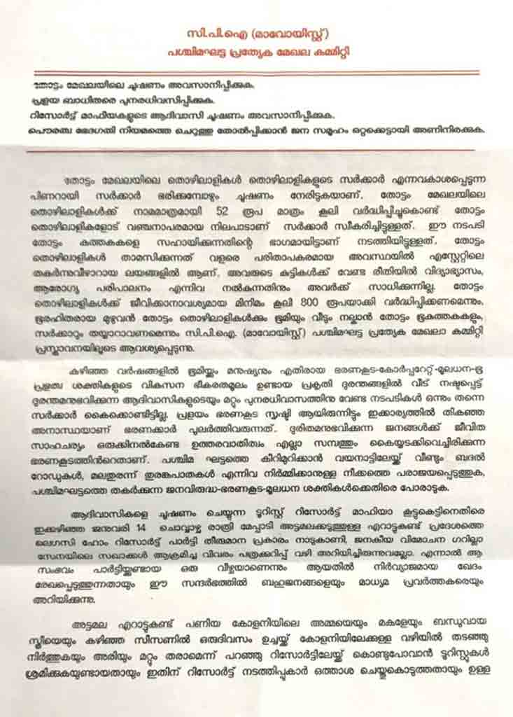 text_fieldsകൽപറ്റ: മേപ്പാടി അട്ടമലക്കടുത്ത് എറാട്ടകുണ്ട് ലെഗസി ഹോം റിസോർട്ട് ആക്രമിച്ച ത് പാർട്ടിക്ക് സംഭവിച്ച വീഴ്ചയാണെന്ന വിശദീകരണവുമായി സി.പി.ഐ (മാവോയിസ്റ്റ്) പ ശ്ചിമ ഘട്ട പ്രത്യേക മേഖല കമ്മിറ്റി. ജനുവരി 14ന് രാത്രിയാണ് റിസോർട്ടിെൻറ ചില്ലുക ൾ തകർത്തത്. വ്യാഴാഴ്ച വയനാട് പ്രസ് ക്ലബിൽ തപാലിൽ ലഭിച്ച മാവോവാദി വക്താവ് ജോഗിയുടെ േപരിലുള്ള കുറിപ്പിലാണ് മാവോവാദികൾ ആക്രമണത്തെ തള്ളിപ്പറയുന്നത്.