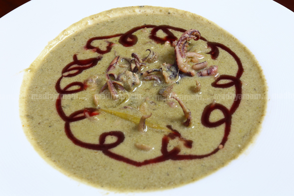 തേങ്ങാപാൽ, േബ്രാത്ത്, ഇഞ്ചി, ലെമൺ ഗ്രാസ്, പച്ച മുളക് എന്നിവ സോസ്പാനിൽ നല്ല തീയിൽ തിളപ്പിക്കുക. ഇതിലേക്ക് കണവ റിങ്ങുകൾ, തല, കൂൺ, നാരങ്ങ നീര്, ഫിഷ്സോസ്, ബ്രൗൺ ഷുഗർ, ഗ്രീൻ കറി പേസ്റ്റ് എന്നിവ ചേർക്കുക. തീ കുറച്ച് കണവ നന്നായി വേവുന്നതുവരെ വേവിക്കുക (അഞ്ച്–10 മിനിറ്റ്). ലെമൺഗ്രാസ് ഒഴിവാക്കുക. വറുത്ത തേങ്ങ, മല്ലിയില എന്നിവ ഉപയോഗിച്ച് അലങ്കരിച്ച് വിളമ്പാം.