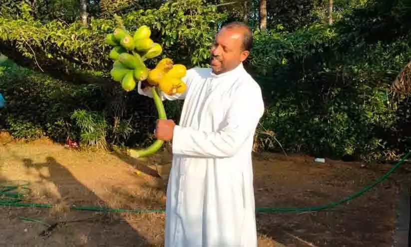 text_fieldsകേരളത്തിൽ വളരെ അപൂർവ്വമായി മാത്രം കൃഷിചെയ്യുന്ന ഇനമാണ് ഇൻഡൊനീഷ്യൻ വാഴയിനമായ പൊപൗലു. ഇനി ഹൈറേഞ്ചിലും ഈ പഴത്തിെൻ്റ രുചി ആസ്വദിക്കാം. ഇടുക്കിയിലെ നെടുങ്കണ്ടം മഞ്ഞപ്പെട്ടി സെൻ്റ് മേരീസ് ദേവാലയ മുറ്റത്താണ് വിളഞ്ഞ് പാകമായ അപൂർവ്വ വാഴക്കുല. കാഴ്ചയ്ക്കു തന്നെ വളരെയധികം കൗതുകമുണർത്തുന്ന ഈ വാഴകുലയുടെ പഴത്തിന് എത്ത പഴത്തിന് സമാനമായ രുചിയാണ്. എന്നാൽ പഴുപ്പിച്ച് ഉപയോഗിക്കാനാവില്ലെന്നതാണ് ഇതിെൻ്റ പ്രധാന സവിശേഷത.