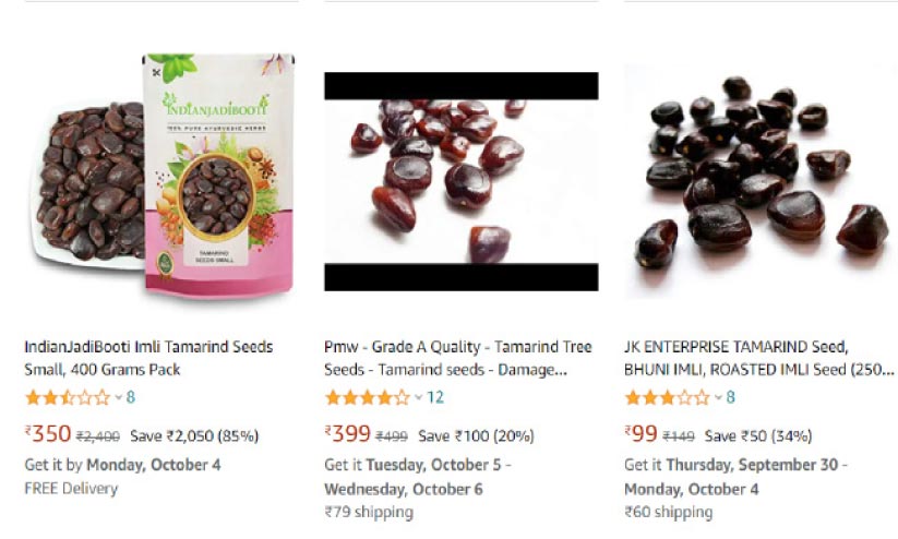 ആമസോണിൽ കാൽ കിലോക്ക് 149 രൂപ, അര കിലോക്ക് 399 രൂപ, വറുത്തതാണെങ്കിൽ 900 ഗ്രാമിന് 299 രൂപ എന്നിങ്ങനെ പോകുന്നു വില. ഫ്ലിപ്കാർട്ടിലെത്തുമ്പോൾ 100 ഗ്രാമിന് 125, 50 കുരുവുള്ള പാക്കറ്റിന് 149, ആയിരം കുരുവുള്ള ഒരു കിലോ പാക്കറ്റിന് 649, വറുത്തെടുത്ത 200 കുരുക്കളടങ്ങിയ പാക്കറ്റിന് 120 രൂപ എന്നിങ്ങനെയാണ് വില. ഇവക്കെല്ലാം കീഴിൽ പലരും വാങ്ങി ഉപയോഗിച്ചതിെൻറ അഭിപ്രായവും രേഖപ്പെടുത്തിയിട്ടുണ്ട്. പുളിയും കുരുവും മാത്രമല്ല, പുളിങ്കുരു പൊടിച്ചതും കിട്ടും ഓൺലൈനിൽ.