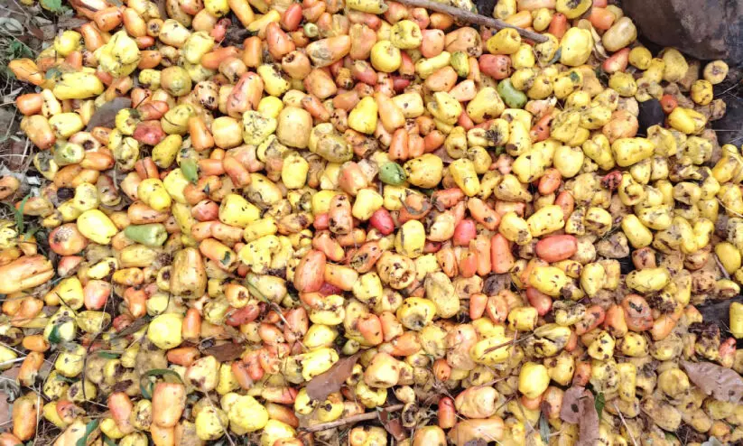 നാരങ്ങത്തട്ടിലെ കശുമാവ് തോട്ടത്തിൽ ഉപയോഗശൂന്യമായി കൂട്ടിയിട്ടിരിക്കുന്ന കശുമാങ്ങ