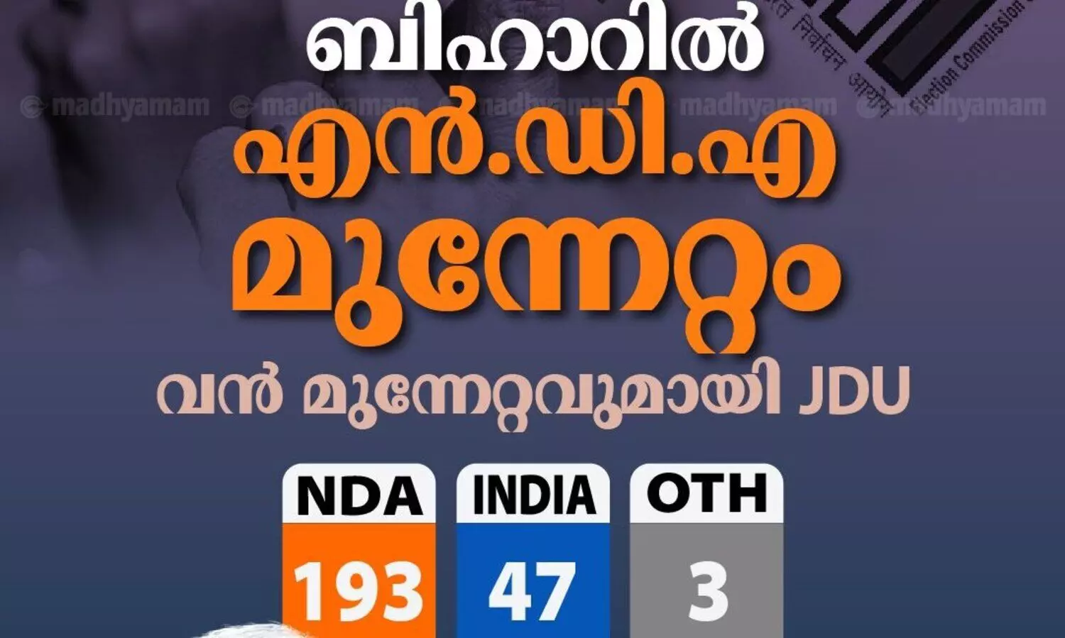 വോട്ടെണ്ണൽ പുരോഗമിക്കുന്നു. എൻ.ഡി.എ 190 സീറ്റുകളിൽ ലീഡ് ചെയ്യുമ്പോൾ മഹാസഖ്യം 49 സീറ്റുകളിലേക്ക് ചുരുങ്ങി. സമീപകാലത്തെ വമ്പൻ വിജയത്തിലേക്കാണ് ബി.ജെ.പി സഖ്യത്തിന്റെ മുന്നേറ്റം.