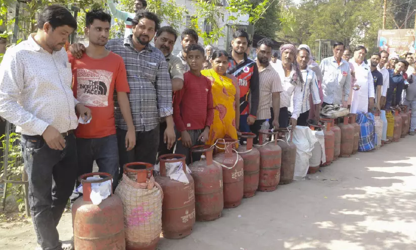 യു.പിയിലെ കാൺപൂരിൽ ഗ്യാസ് ഏജൻസിക്ക് പുറത്ത് എൽ.പി.ജി സിലിണ്ടറുകൾ വാങ്ങാൻ വരിനിൽക്കുന്നവർ