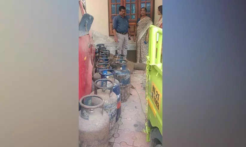 ഉദ്യോഗസ്ഥർ പിടികൂടിയ ഗ്യാസ് സിലിണ്ടറുകൾ