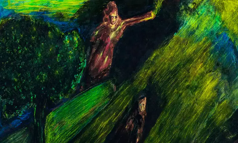 ഇരുളിൽ ഒരു മലഞ്ചരിവിൽ രണ്ട് മനുഷ്യ രൂപങ്ങൾ നിൽക്കുന്ന ചിത്രമാണ് ടാഗോർ വരച്ചത്. ഒരാളുടെ കൈയ്യിൽ ഒരു വിളക്കും വെളിച്ചവുമുണ്ട്.