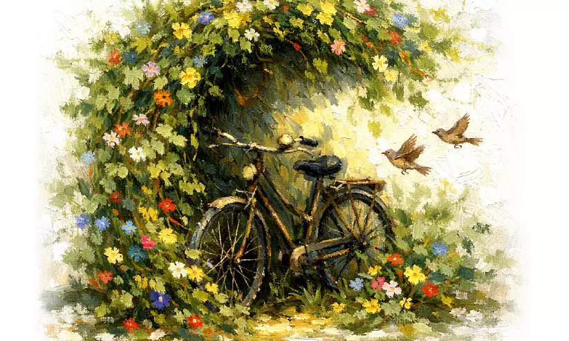 പഴയ പ്രണയ ലേഖനങ്ങള് വീണ്ടും വായിച്ച് അക്ഷരത്തെറ്റുകളും പ്രയോഗങ്ങളിലെ എക്കും പക്കും ഒടിവും ചതവും നേരെയാക്കുന്നതുപോലെ പ്രിയപ്പെട്ട സൈക്കിളിന്റെ കേടുപാടുകള് തീര്ത്ത് അയാള് അതിന്റെ രാഗവും താളവും സുഗമമാക്കി. രാത്രിയുടെ ഏകാന്തതയില് ആഞ്ഞിലിക്കൊമ്പില്നിന്ന് പറന്നിറങ്ങി വന്ന നത്ത് നിനക്കാരുമില്ലേ, നിനക്കാരുമില്ലേ എന്ന് പല ദിനങ്ങളിലും അതിനോട് ചോദിച്ചു. പ്രഭാതങ്ങളില് തിരിച്ചെത്തിയ അയാള് തണുത്തുവിറച്ച അതിന്റെ മേനിയില് നിന്ന് പച്ചപ്പുല് പടര്പ്പുകളെ സ്നേഹത്തോടെ അഴിച്ചെടുത്ത് സമീപത്തെ പച്ചപ്പുല് തൽപത്തിലേക്ക് തിരികെവെച്ചു. ചില ദിവസങ്ങളില് ചുവപ്പും നീലയും മഞ്ഞയും നിറമുള്ള പലതരം കുഞ്ഞിപ്പൂവുകള് വിടര്ന്നുനിൽപുണ്ടാകും. തലേന്നാള് സന്ധ്യക്ക് അവയെല്ലാം പൂമൊട്ടുകളായിരുന്നു.