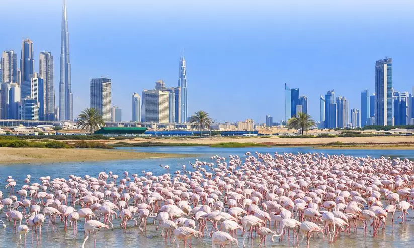 ദുബൈയിലെ പല രൂപങ്ങളും ഞാൻ കണ്ടിട്ടുണ്ട്. കണ്ണുതുറക്കാതെ കുതിക്കുന്ന റോഡുകൾ, ഗ്ലാസ്സിൽ സൂര്യനെ കുതിച്ചുയരുന്ന ആകാശഹരങ്ങൾ, ആഡംബരത്തിന്റെ പ്രകാശം. എന്നാൽ ഒരു ശനിയാഴ്ചയുടെ മന്ദപ്രഭയിൽ, ഞാൻ കണ്ട ദുബൈ അതല്ലായിരുന്നു. കണ്ണിനു കുളിർമയേകുന്ന ഒരുതരം പിങ്ക് നിറത്തിൽ ശ്വസിക്കുന്ന ഒരു നിശ്ശബ്ദതയായിരുന്നു. ദുബൈയുടെ തിരക്കേറിയ നഗരഹൃദയത്തിൽനിന്ന് ഏകദേശം 15 കിലോമീറ്റർ മാത്രം അകലെയായി, മറ്റൊരു ലോകത്തിന്റെ നിശ്ശബ്ദത പകരുന്ന ഒരു സ്വർഗ്ഗഭൂമിയാണ് ഫ്ലമിംഗോ പക്ഷികളുടെ അഭയകേന്ദ്രം. ഗ്ലാസ് ഗോപുരങ്ങൾക്കപ്പുറം, നിശ്ശബ്ദതയുടെ തടാകമായി വിരിഞ്ഞിരിക്കുന്നത് ദുബൈയുടെ റാൽഖോർ എന്ന സ്ഥലത്താണ്.