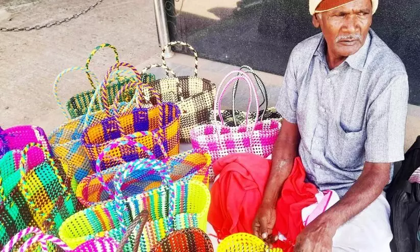 നെടുങ്കണ്ടം ടൗണില് നെയ്ത്തുസഞ്ചിയുമായി വഴിയോരത്ത് വില്പ്പന നടത്തുന്ന വയോധികന്
