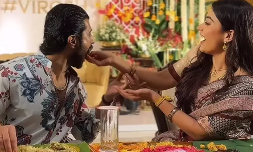 പരിപാടിക്കിടയിൽ രശ്മിക വിജയിയെ സ്വന്തം കൈകൊണ്ട് ഭക്ഷണം ഊട്ടുന്ന വിഡിയോ സോഷ്യൽ മീഡിയയിൽ തരംഗമായി മാറി. ലളിതമായ പ്രിന്റഡ് സാരിയും സിന്ദൂരവും മംഗളസൂത്രവും അണിഞ്ഞാണ് രശ്മിക എത്തിയത്. ഫ്ലോറൽ കുർത്തയായിരുന്നു വിജയിന്റെ വേഷം. തങ്ങളുടെ പ്രണയത്തെക്കുറിച്ചുള്ള രസകരമായ കാര്യങ്ങളും അവർ ആരാധകരോട് പങ്കുവെച്ചു. വിജയിനോട് ആദ്യം വിവാഹാഭ്യർത്ഥന നടത്തിയത് രശ്മികയായിരുന്നു എന്ന വെളിപ്പെടുത്തൽ ആരാധകർ ഏറ്റെടുത്തിരിക്കുകയാണ്. ഇന്ന് ഹൈദരാബാദിൽ നടക്കുന്ന വിവാഹ സൽക്കാരത്തിൽ തെലുങ്ക്, ഹിന്ദി, തമിഴ്, മലയാളം, കന്നഡ സിനിമയിലെ പ്രമുഖർ പങ്കെടുക്കും. സുരക്ഷാ കാരണങ്ങളാൽ ക്ഷണം ലഭിച്ചവർക്ക് മാത്രമാണ് പ്രവേശനം. പ്രധാനമന്ത്രി നരേന്ദ്ര മോദിയെയും ചടങ്ങിലേക്ക് ക്ഷണിച്ചിട്ടുണ്ട്.