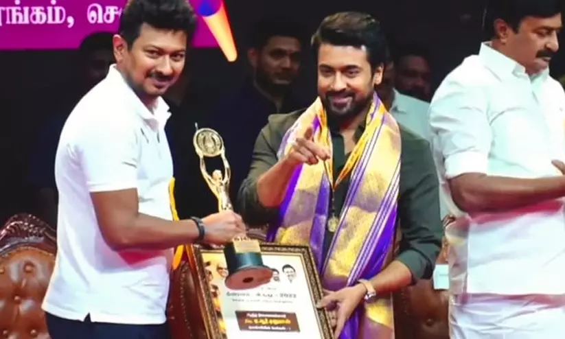 കഴിഞ്ഞ ദിവസമാണ് തമിഴ്നാട് സർക്കാർ സംസ്ഥാന ചലച്ചിത്ര പുരസ്കാരങ്ങൾ വിതരണം ചെയ്തത്. 2016 മുതൽ 2022 വരെയുള്ള സംസ്ഥാന ചലച്ചിത്ര അവാർഡുകളാണ് തമിഴ്നാട് സർക്കാർ വിതരണം ചെയ്തത്. ഇപ്പോഴിതാ, മികച്ച നടനുള്ള അവാർഡ് സൂര്യ ഏറ്റുവാങ്ങുന്ന വിഡിയോ സമൂഹമാധ്യമത്തിൽ വൈറലാണ്. സൂര്യയുടെ അവാർഡ് വാങ്ങൽ വൈറലായതിന് പിന്നിൽ ഒരു കാരണമുണ്ട്.
