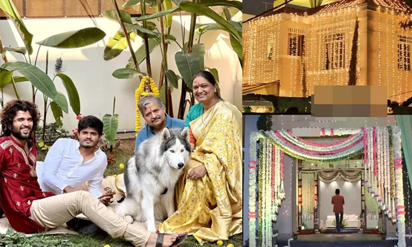 ഇപ്പോഴിതാ വിജയ് ദേവരകൊണ്ടയുടെ വീട്ടിലെ കല്യാണ ഒരുക്കങ്ങളാണ് ശ്രദ്ധേയമാകുന്നത്. മനോഹരമായി അലങ്കരിച്ച വീടിന്റെ ഫോട്ടോകൾ ആരാധകർ പങ്കുവെച്ചു. മൂന്ന് കോണുകളിലും ലൈറ്റുകൾ കൊണ്ട് അലങ്കരിച്ചിരിക്കുന്ന വീടിന് ചുറ്റും പുഷ്പാലങ്കാരങ്ങളുമുണ്ട്. വിവാഹത്തിന് മുന്നോടിയായി വധുവിന്റെയും വരന്റെയും വീട് ലൈറ്റുകൾ കൊണ്ട് അലങ്കരിക്കുന്നത് പല ഇന്ത്യൻ സമൂഹങ്ങളിലും പതിവാണ്. ചിത്രങ്ങൾ ഓൺലൈനിൽ പ്രത്യക്ഷപ്പെട്ടതോടെ ആരാധകർ ഇരുവർക്കും ആശംസകളുമായി എത്തുകയാണ്.