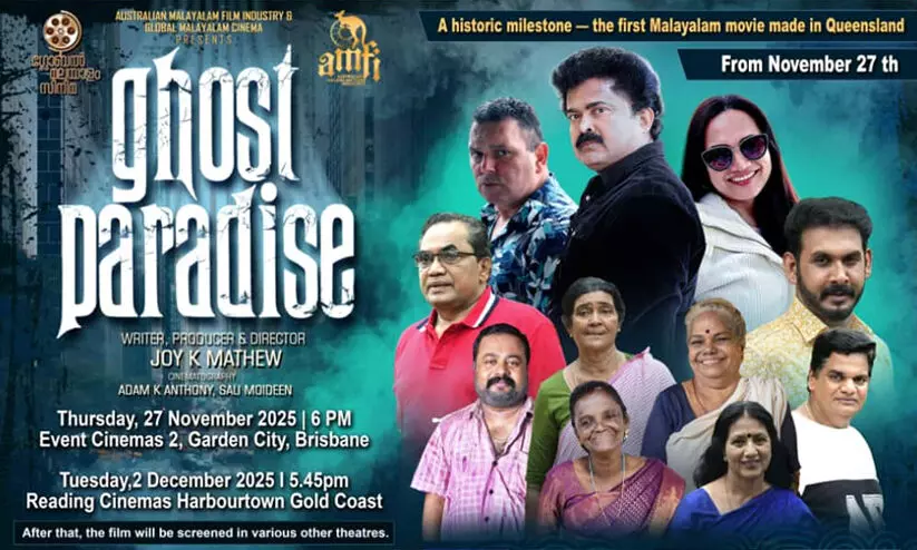 കൊച്ചി: ക്വീന്സ്ലാന്ഡിലെ ആദ്യ മലയാള ചലച്ചിത്രമായ 'ഗോസ്റ്റ് പാരഡൈസ്' നവംബര് 27ന് ക്വീന്സ്ലാന്ഡില് ബ്രിസ്ബെനിലെ ഇവന്റ് സിനിമാസിൽ പ്രദർശിപ്പിക്കും. ഇരുപത്തിയാറോളം ആസ്ട്രേലിയന് മലയാളി കലാകാരന്മാരാണ് ഗോസ്റ്റ് പാരഡെയ്സിലൂടെ സിനിമയില് അരങ്ങേറ്റം കുറിക്കുന്നത്. ജോയ് കെ.മാത്യുവിന്റെ കീഴില് ചലച്ചിത്ര കലാ പരിശീലനം ലഭിച്ചവരെയും കേരളത്തിലെ പ്രമുഖ മലയാള ചലച്ചിത്ര നടീനടന്മാരേയും ആസ്ട്രേലിയന് ചലച്ചിത്ര-ടെലിവിഷന് രംഗത്ത് പ്രവര്ത്തിക്കുന്നവരെയും ഉള്പ്പെടുത്തിയുള്ള ക്വീന്സ്ലാന്ഡിലെ ആദ്യ മലയാള സിനിമയാണിത്.
