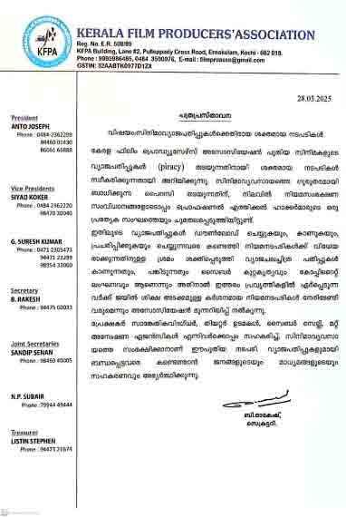 പൈറസി തടയുന്നതിന് ശക്തമായ നടപടിയ്ക്കൊരുങ്ങി കേരള ഫിലിം പ്രൊഡ്യൂസേഴ്സ് അസോസിയേഷൻ. നിലവിൽ നിയമസംരക്ഷണ സംവിധാനങ്ങളോടൊപ്പം പ്രൊഫഷണൽ എത്തിക്കൽ ഹാക്കർമാരുടെ ഒരു പ്രത്യേക സംഘത്തെയും അസോസിയേഷൻ ചുമതലപ്പെടുത്തിയിട്ടുണ്ട്. കേരള ഫിലിം പ്രൊഡ്യൂസേഴ്സ് അസോസിയേഷൻ പുറത്തുവിട്ട വാർത്താകുറിപ്പിലൂടെയാണ് ഇക്കാര്യം അറിയിച്ചത്.