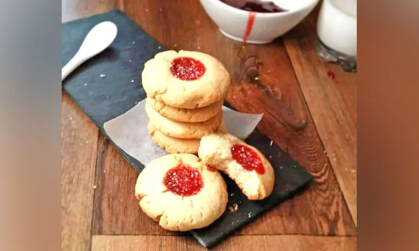3. അതിൽനിന്ന് ഏകദേശം 18 - 20 ഉരുളകൾ ഉണ്ടാക്കി ഓരോന്നും കുക്കിയുടെ ആകൃതി ലഭിക്കാൻ ചെറുതായി അമർത്തുക. ഇതിന്റെ മധ്യഭാഗത്ത് വിരലുകൊണ്ട് ചെറുതായി അമർത്തി അല്പം ജാം നിറക്കുക. ഗ്രീസ് പുരട്ടിയ ബേക്കിങ് പാനിൽ വെക്കുക.