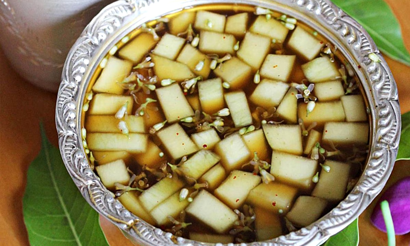 പുളി കഴുകിയ ശേഷം ½ കപ്പ് ചെറുചൂടുള്ള വെള്ളത്തിൽ കുതിർക്കുക. വേപ്പിൻ തണ്ടിൽ നിന്ന് പൂക്കളോട് കൂടിയ തളിരിലകൾ പറിച്ചെടുക്കുക. ഒരു കപ്പ് വെള്ളത്തിൽ പൊടിച്ചെടുത്ത ശർക്കര ചേർക്കുക. ശർക്കര ഉരുകുന്നത് വരെ ഇളക്കുക.