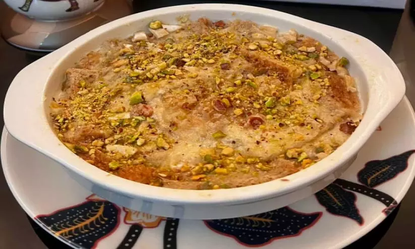 തിളപ്പിച്ച പാലിലേക്ക് പഞ്ചസാര, കണ്ടൻസ്ഡ് മിൽക്ക്, ഫ്രെഷ് ക്രീം എന്നിവ ചേർത്ത് ഇളക്കി പകുതിയായി വറ്റിക്കുക. ക്രോയിസന്റ് ബ്രെഡ് ചെറുതായി അരിഞ്ഞ് മറ്റൊരു പാത്രത്തിൽ വയ്ക്കുക. ഇതിലേക്ക് അണ്ടിപ്പരിപ്പ്, ഉണക്കമുന്തിരി, ബദാം, പിസ്ത എന്നിവ ചേർക്കുക. കുറുക്കിയ പാൽ ഒഴിച്ച് മുകളിൽ പഞ്ചസാര വിതറിയ ശേഷം ഓവനിൽ 200 ഡിഗ്രി സെൽഷ്യസിൽ 15 മിനിറ്റ് ബേക്ക് ചെയ്തെടുക്കുക. ഉമ്മു അലി റെഡി.