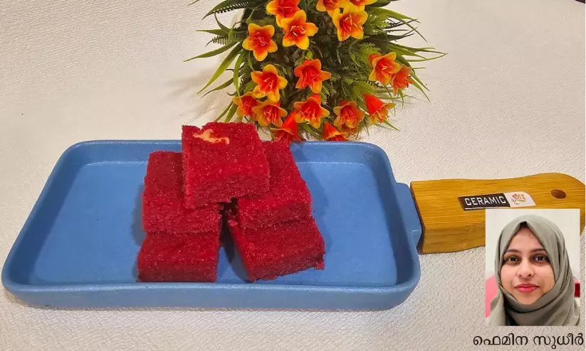 ഒരു ട്രേയിൽ നെയ്യ് പുരട്ടി അതിലേക്കു ചൂടോടു കൂടെ ബീറ്റ്റൂട്ട് മിക്സ് ഇട്ടു ഒന്ന് പരത്തി കൊടുക്കാം. ചൂട് നന്നായി മാറിയതിനു ശേഷം കട്ട് ചെയ്തു ഉപയോഗിക്കാം.