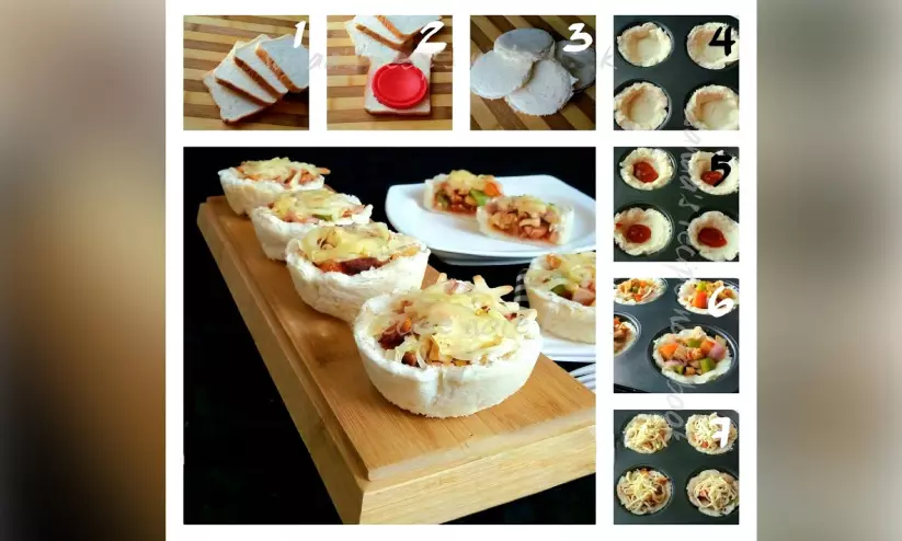 3. തയാറാക്കിയ ബ്രെഡ് കപ്പുകളിൽ കുറച്ച് പിസ സോസ് ഒഴിച്ച്, മുകളിലേക്ക് തയാറാക്കിയ ചിക്കൻ മിശ്രിതം നിറക്കുക.
