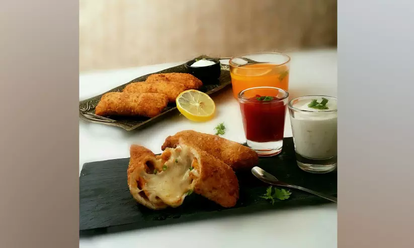2. ഒരു പരത്തിയ ബ്രെഡ് സ്ലൈസിന്റെ അറ്റത്ത് തയ്യാറാക്കിയ ചിക്കൻ ഫില്ലിങ് അൽപം വെച്ച് അതിന്റെ മേൽ കുറച്ച് മൊസറെല്ല ചീസ് വിതറുക. ശേഷം ബ്രെഡ് റോൾ ചെയ്ത് സ്റ്റിക്ക് രൂപത്തിൽ ആക്കുക. ബാക്കിയുള്ള സ്ലൈസുകളിലും ഇതേ രീതിയിൽ ചെയ്യുക.