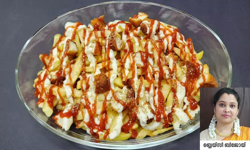സെറ്റ് ചെയ്യാനുദ്ദേശിക്കുന്ന പാത്രത്തിൽ ആദ്യം ഫ്രഞ്ച് ഫ്രൈസ് നിരത്തുക. ഇതിന്റെ മുകളിൽ നഗെറ്റ്സും നിരത്തുക. ഇതിന്റെ മുകളിലേക്ക് തയാറാക്കി മാറ്റിവെച്ച വൈറ്റ് സോസും, ടൊമാറ്റോ സോസും ഒറിഗാനയും ചേർക്കുക. വീണ്ടും ഫ്രഞ്ച് ഫ്രൈസും നഗെറ്റ്സും നിരത്തി അതിന്റെ മുകളിൽ വൈറ്റ് സോസും, ടൊമാറ്റോ സോസും ഒറിഗാനയും ചേർത്ത് കഴിക്കാം.