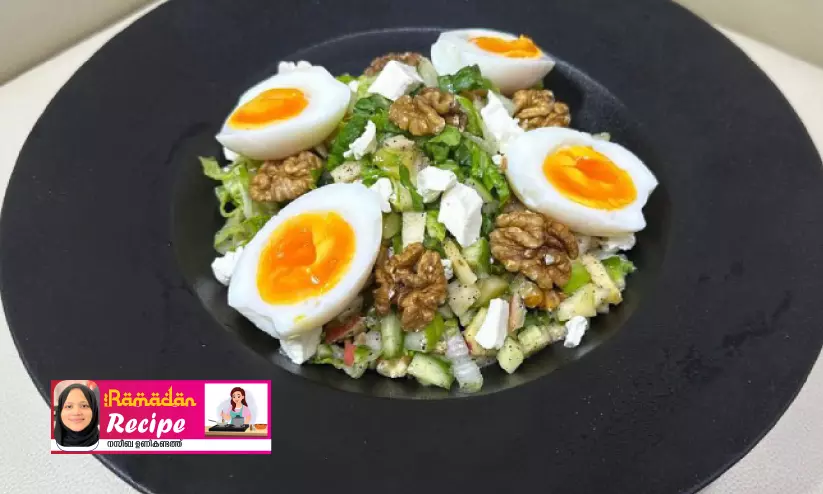 ഇതിന് മുകളിൽ വട്ടത്തിൽ അരിഞ്ഞ മുട്ട, വാൾനട്ട്, ബദാം, മത്തങ്ങ വിത്ത്, സൺഫ്ലവർ വിത്ത് എന്നിവ ചേർത്ത് നന്നായി ഇളക്കുക.