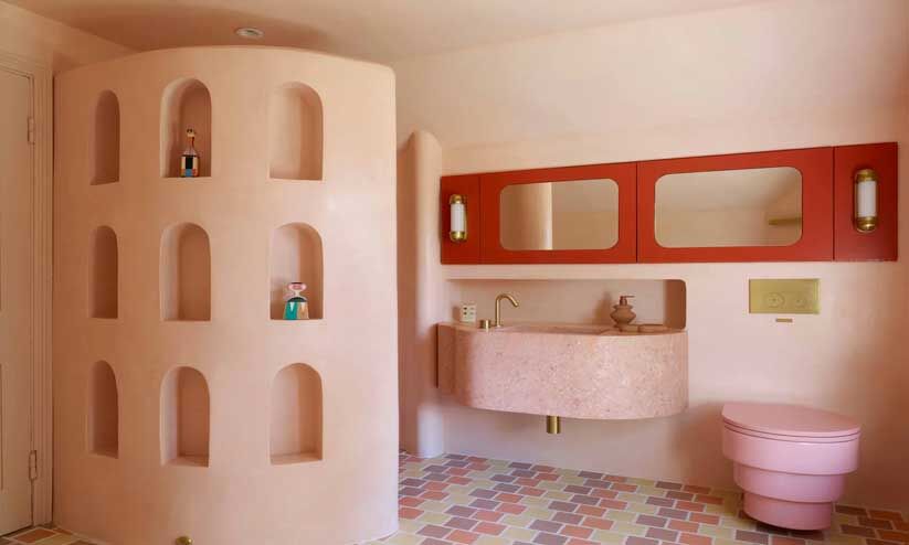പിങ്ക്, ഓറഞ്ച് നിറങ്ങൾക്കിടയിലുള്ള മൃദുവായ പീച്ച് നിങ്ങളുടെ കുളിമുറിക്ക് ഊഷ്മളത നൽകും.
