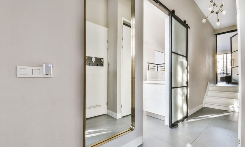 മുൻവാതിലിനു എതിർവശത്തുള്ള പ്രവേശന കവാടത്തിൽ ഒരു ഗ്ലാസ് പാനലുള്ള ഒരു കണ്ണാടി മുഴുവൻ പ്രവേശന കവാടത്തെയും പ്രകാശിപ്പിക്കും. കൂടാതെ, വിളക്കുകൾക്ക് പിന്നിലോ ലൈറ്റ് ഫിക്ചറുകൾക്ക് സമീപമോ കണ്ണാടികൾ സ്ഥാപിക്കുന്നത് മുറിയിലുടനീളം വെളിച്ചം കൂടുതൽ തുല്യമായി പരത്താൻ സഹായിക്കുന്നു. ഇത് മുറി കൂടുതൽ തിളക്കമുള്ളതും ആകർഷകവുമാക്കുന്നു.