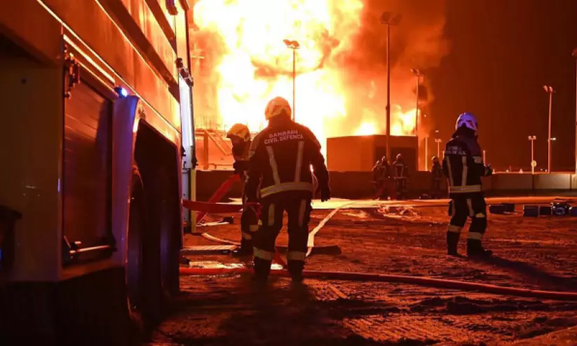 ഇറാന്റെ ആക്രമണത്തിൽ മുഹറഖിൽ ഇന്ധന സംഭരണ ടാങ്കിന് തീപ്പിടിച്ചപ്പോൾ സിവിൽ ഡിഫൻസ് സംഘം രക്ഷാപ്രവർത്തനം നടത്തുന്നു