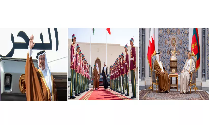 ഒമാൻ സന്ദർശനത്തിനായി എത്തിയ ബഹ്റൈൻ കിരീടാവകാശിയും പ്രധാനമന്ത്രിയുമായ സൽമാൻ ബിൻ ഹമദ് അൽ ഖലീഫ ഒമാൻ സാമ്പത്തിക കാര്യ ഉപപ്രധാനമന്ത്രി സയ്യിദ് ദി യസിൻ ബിൻ ഹൈതമിനെ അഭിവാദ്യംചെയ്യുന്നു (ഇടത്ത്), ഇരുവരെയും വിമാനത്താവളത്തിൽ റോയൽ ആർമി ബഹുമതികളോടെ സ്വീകരിക്കുന്നു (മധ്യത്തിൽ), മസ്കത്തിലെ അൽ ബറക്ക കൊട്ടാരത്തിൽ സുൽത്താ ഹൈതം ബിൻ താരിഖുമായി സൽമാൻ ബിൻ ഹമദ് അൽ ഖലീഫ കൂടിക്കാഴ്ച നടത്തുന്നു