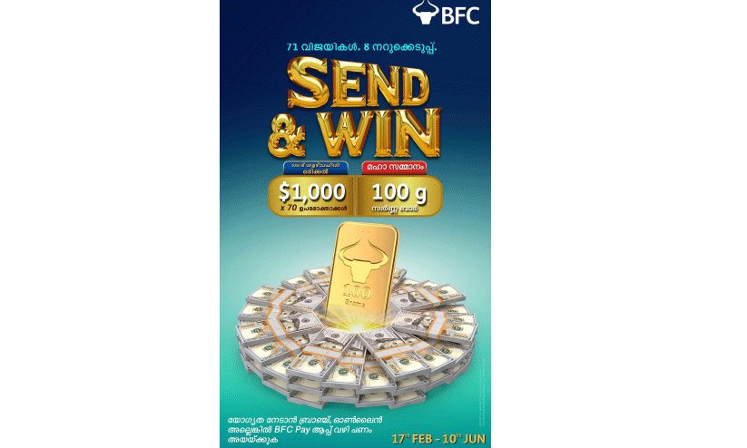സമ്മാനങ്ങൾ സ്വന്തമാക്കാൻ ഉപഭോക്താക്കൾക്ക് ഇനിയും അവസരമുണ്ട്. ഓരോ രണ്ടാഴ്ച കൂടുമ്പോഴും നടക്കുന്ന നറുക്കെടുപ്പിലൂടെ 1,000 ഡോളർ വീതം നേടാനുള്ള അവസരം കാമ്പയിൻ കാലയളവിൽ ഉടനീളം ലഭ്യമാണ്. കൂടാതെ, ഈ സീസണിലെ ഏറ്റവും ആകർഷകമായ ബമ്പർ സമ്മാനം 100 ഗ്രാം സ്വർണ്ണക്കട്ടിയാണ്. വരും ആഴ്ചകളിൽ നടക്കുന്ന നറുക്കെടുപ്പിലൂടെ ഈ മെഗാ സമ്മാനം ആർക്കും സ്വന്തമാക്കാം. ബി.എഫ്.സിയുടെ ഏതെങ്കിലും ബ്രാഞ്ച് വഴിയോ വെബ്സൈറ്റ് വഴിയോ പണം അയക്കുന്നവർക്ക് നറുക്കെടുപ്പിന്റെ ഭാഗമാകാം. ബി.എഫ്.സി പേ ആപ്പ് വഴി ഇടപാടുകൾ നടത്തുന്നവർക്കും ഈ സുവർണ്ണാവസരം ലഭിക്കും.