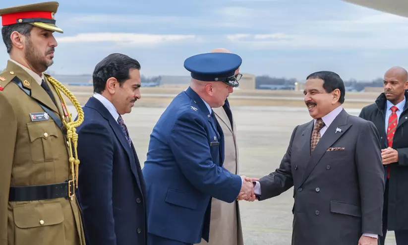 വാഷിങ്ടണിലെത്തിയ ഹമദ് രാജാവിനെ വിമാനത്താവളത്തിൽ സ്വീകരിക്കുന്നു