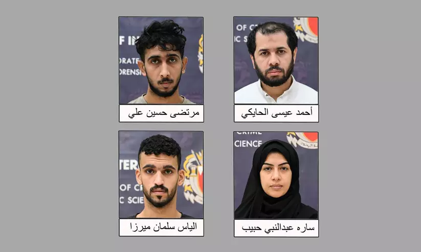 മുർതദ ഹുസൈൻ അവാൽ (25), അഹമ്മദ് ഈസ അൽ ഹൈക്കി (34), സാറ അബ്ദുൽനബി മർഹൂൺ (36), ഇല്യാസ് സൽമാൻ മിർസ (22) എന്നിവരാണ് അറസ്റ്റിലായത്. അഞ്ചാം പ്രതിയായ അലി മുഹമ്മദ് ഹസൻ അൽ ശൈഖ് (25) എന്നയാൾ വിദേശത്തേക്ക് കടന്നതായാണ് വിവരം. അറസ്റ്റിലായ ഒന്നാം പ്രതി മുർതദ ഹുസൈൻ, ഇറാനിലുള്ള ഭീകരവാദ ഘടകങ്ങളിൽ നിന്ന് ലഭിച്ച കൃത്യമായ നിർദ്ദേശപ്രകാരമാണ് പ്രവർത്തിച്ചിരുന്നത്.