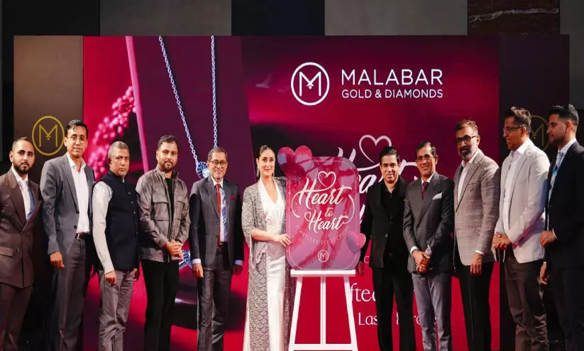 പ്രണയകാലത്തെ വരവേൽക്കുന്നതിനായി മലബാർ ഗോൾഡ് ആൻഡ് ഡയമണ്ട്സ് പുറത്തിറക്കിയ ഹാർട്ട് ടു ഹാർട്ട് കലക്ഷന്റെ ലോഞ്ചിങ് ബോളിവുഡ് താരം കരീന കപൂർഖാൻ നിർവഹിക്കുന്നു. മലബാർ ഗ്രൂപ് വൈസ് ചെയർമാൻ കെ.പി അബ്ദുൽ സലാം, മലബാർ ഗോൾഡ് ആൻഡ് ഡയമണ്ട്സ് ഇന്റർനാഷനൽ ഓപറേഷൻസ് എം.ഡി.ഷംലാൽ അഹമ്മദ്, മലബാർ ഗ്രൂപ് എക്സിക്യൂട്ടിവ് ഡയറക്ടർ എ.കെ.നിഷാദ്, മലബാർ ഗ്രൂപ് ഡയറക്ടർ അബ്ദുൽ മജീദ്, മാനുഫാക്ചറിങ് ഹെഡ് എ.കെ.ഫൈസൽ, ഫിനാൻസ് ആൻഡ് അഡ്മിൻ ഡയറക്ടർ സി.എം.സി.അമീർ, ചീഫ് ഡിജിറ്റൽ ഓഫിസർ ഷാജി കക്കോടി എന്നിവർ സമീപം