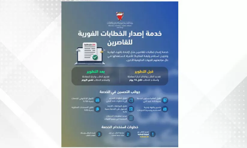 ഈ സംവിധാനം വന്നതോടെ, ഗുണഭോക്താക്കൾക്ക് ആവശ്യമായ അംഗീകൃത ഔദ്യോഗിക കത്തുകൾ മന്ത്രാലയത്തിന്റെ സർവിസ് സെന്റർ വഴിയോ ‘ബഹ്റൈൻ.ബിഎച്ച്’ (bahrain.bh) എന്ന നാഷനൽ ഇ-ഗവൺമെന്റ് പോർട്ടൽ വഴിയോ മിനിറ്റുകൾക്കുള്ളിൽ കൈപ്പറ്റാം.