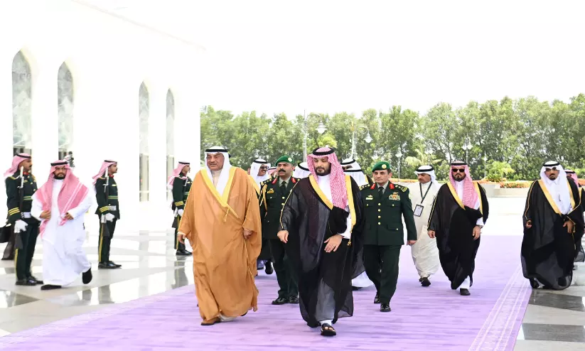 കിരീടാവകാശി ശൈഖ് സബാഹ് ഖാലിദ് അൽ ഹമദ് അൽ മുബാറക് അസ്സബാഹിനെ സൗദി കിരീടാവകാശിയും പ്രധാനമന്ത്രിയുമായ അമീർ മുഹമ്മദ് ബിൻ സൽമാൻ സ്വീകരിക്കുന്നു