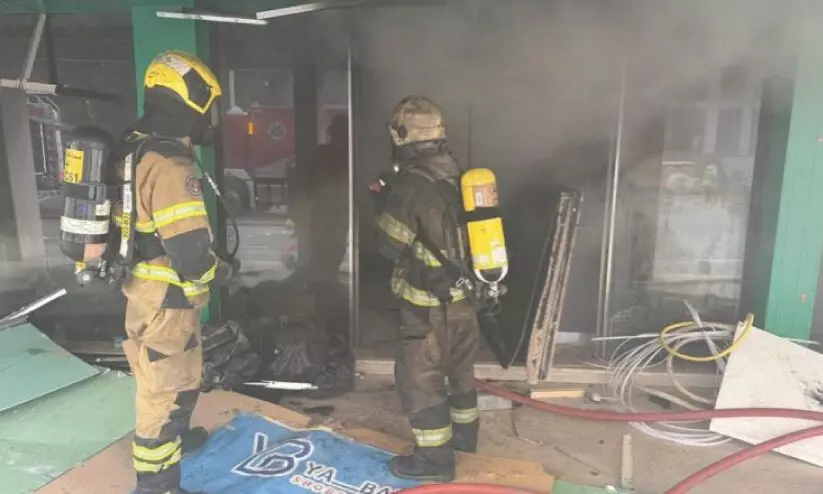 ഓൾഡ് സാൽമിയ സൂഖിലെ കെട്ടിടത്തിൽ തീപിടിത്തം അണക്കുന്ന അഗ്നിശമന സേനാംഗങ്ങൾ