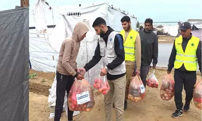 ഗസ്സയിൽ പച്ചക്കറി കിറ്റുകൾവിതരണം ചെയ്യുന്ന നാമ ചാരിറ്റി പ്രവർത്തകർ