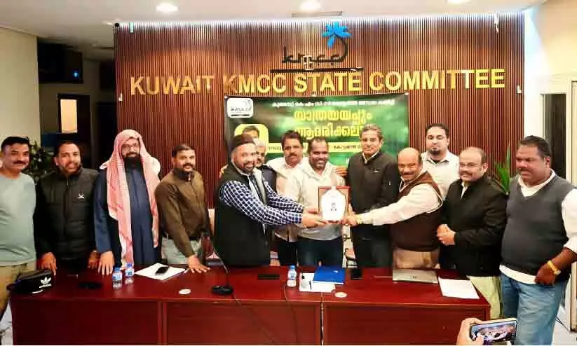 ടി.പി. ഷറഫുവിന് കെ.എം.സി.സി സ്റ്റേറ്റ് പ്രസിഡന്റ് നാസർ അൽ മശ്ഹൂർ തങ്ങൾ ഷറഫു ടി.പിക്ക് ഉപഹാരം കൈമാറുന്നു