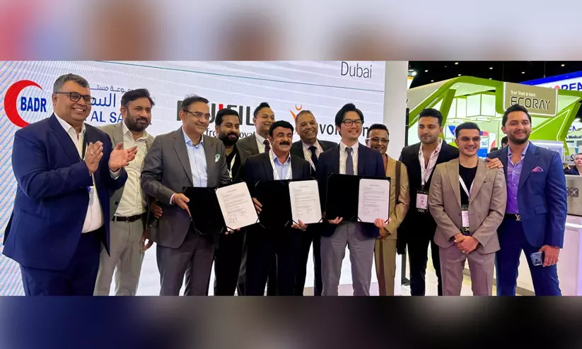 ദുബൈയിൽ നടന്ന വേൾഡ് ഹെൽത്ത് എക്സ്പോ വേദിയിൽ ഫ്യുജി ഫിലിമുമായി ബദർ അൽ സമ റോയൽ ഹോസ്പിറ്റൽ ധാരണപത്രത്തിൽ ഒപ്പുവെച്ചപ്പോൾ