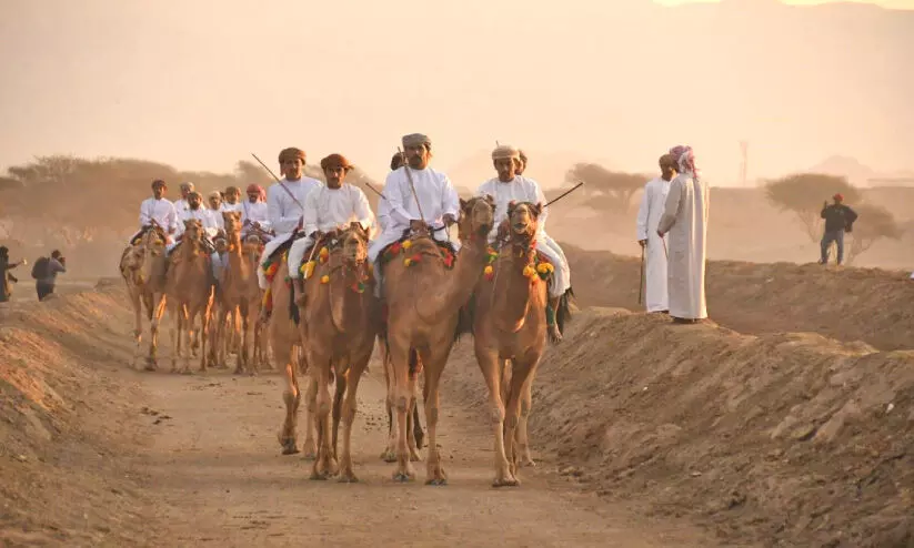 മസ്കത്ത് ഗവർണറേറ്റിലെ ആമിറാത്ത് വിലായത്തിൽ ശനിയാഴ്ച ഒട്ടകങ്ങളുമായി മത്സരങ്ങളിൽ പങ്കെടുക്കാനെത്തിയവർ