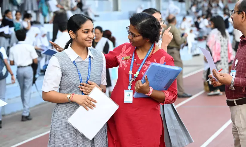 തിങ്കളാഴ്ച ആരംഭിച്ച സി.ബി.എസ്.ഇ പത്താം ക്ലാസ് കണക്കു പരീക്ഷ എഴുതാൻ പരീക്ഷാ ഹാളിലേക്ക് പോകുന്ന തന്റെ വിദ്യാർഥിക്ക് ആശംസ നേരുന്ന അധ്യാപിക. ഇന്ത്യൻ സ്കൂൾ മസ്കത്തിൽ