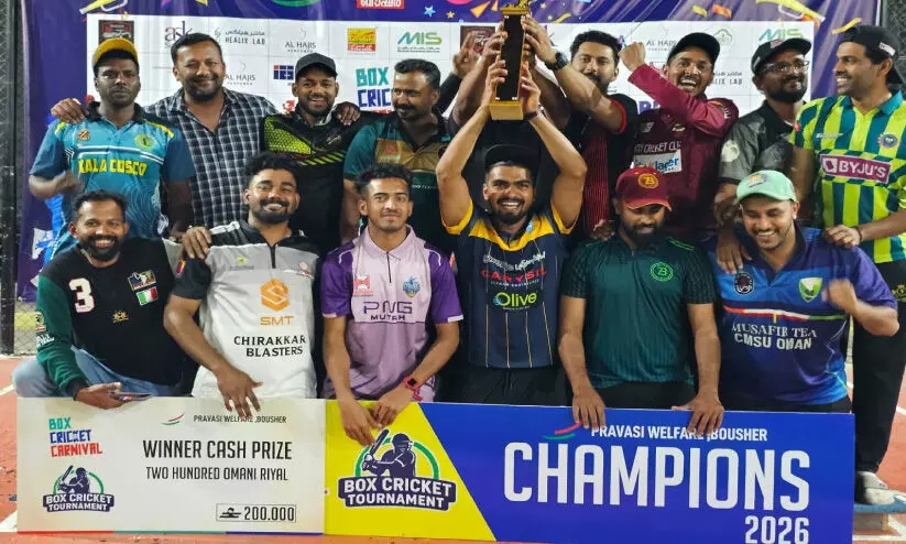 പ്രവാസി വെൽഫെയർ ബൗഷർ മേഖല സംഘടിപ്പിച്ച പ്രഥമ ബോക്സ് ക്രിക്കറ്റ് കാർണിവലിൽ ജേതാക്കളായ എസ്.എഫ്.ടി ചേസേഴ്സ് കോസ്മോസ് സിസി ടീമംഗങ്ങൾ ട്രോഫിയുമായി