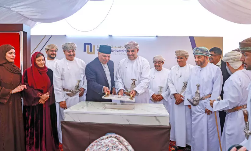 ‘നാഷനൽ യൂനിവേഴ്സിറ്റി - സുൽത്താൻ ഹൈതം സിറ്റി കാമ്പസ് ശിലാസ്ഥാപനം ഭവന -നഗര ആസൂത്രണ മന്ത്രി ഡോ. ഖൽഫാൻ ബിൻ സഈദ് അൽ ഷുഐലിയും നാഷനൽ യൂനിവേഴ്സിറ്റി ചാൻസലർ ഡോ. പി. മുഹമ്മദ് അലിയും ചേർന്ന് നിർവഹിക്കുന്നു