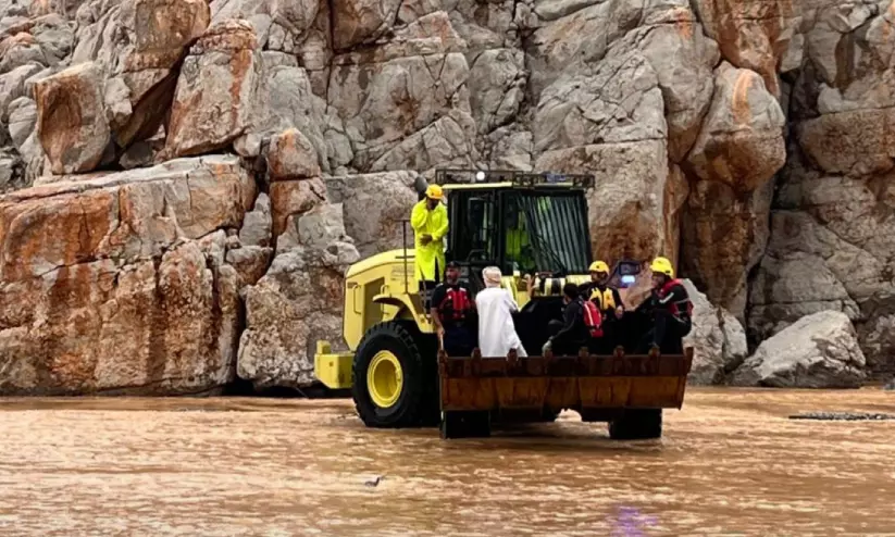 ഖസബിൽ വെള്ളക്കെട്ടിൽ അകപ്പെട്ടവരെ സിവിൽ ഡിഫൻസ് ആൻഡ് ആംബുലൻസ് അതോറിറ്റി രക്ഷപ്പെടുത്തുന്നു