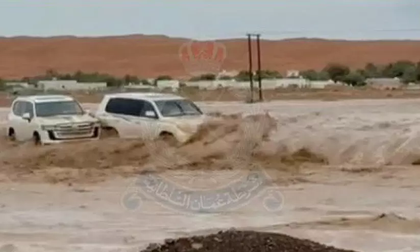 ബിദിയയിൽ ഒഴുക്കുള്ള വാദിയിലൂടെ സഞ്ചരിച്ച് രണ്ട് കാറുകൾ അപകടത്തിൽപെടുന്ന ദൃശ്യം. ഈവാഹനങ്ങളിലെ